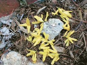 Well, spring has sprung in Louisville and has not escaped the notice of all the children. Bikes racing by, basketballs being dribbled and shot at any kind of apparatus that would serve as a hoop, and the skate boarders risking their very lives. Of course, that’s what they said about us when we were kids. Only then, it was bikes and roller skates——the REAL kind with four wheels on each skate that attached to your shoe and a skate key to tighten it up to your shoe sole. It is a wondrous event, this springtime thing.. It’s like all of life lifts out of its humdrum doldrums and comes alive. I have my darling granddaughter here with me today. We filled the baby pool out on the patio, and she has been in and out of it all day, dressing, undressing, and playing with the abandon that only small children posses. Modesty escapes them because they are comfortable in the bodies they were born in, and the social mores have not smacked upon them yet, to make them self-conscious or embarrassed. Age has not touched them and it would never occur to them that someday they will lose their youth. This sunny, beautiful child IS Spring! I laughed so hard when I walked out and saw her, and what she had rigged up. I had to run and get the camera. She knows no hardship, no pain, no expectations of how things ought to be. She just is just Lulu. She is Spring. Even in the beauty and new growth of spring, she lost her lady bug to the powers that be. I went outside and in my fossil rock collection, she had made a grave for this tiny dead ladybug and decorated it with Forsythia blooms and, one of my fossils, and a little cross that I had in my jewelry box, served as a tombstone. My husband came in laughing and I asked him what was so funny and he told me I had to come out a see the grave. I did more than that—I took a picture. After all, Lulu will have to succumb to growing up someday and I want her to be able to see herself as the child she was. I keep picturing things like panty hose, and first bra, and first boyfriend. EEK! Well, I won’t experience it alone —-I have all my readers to laugh (and sympathize) with me!